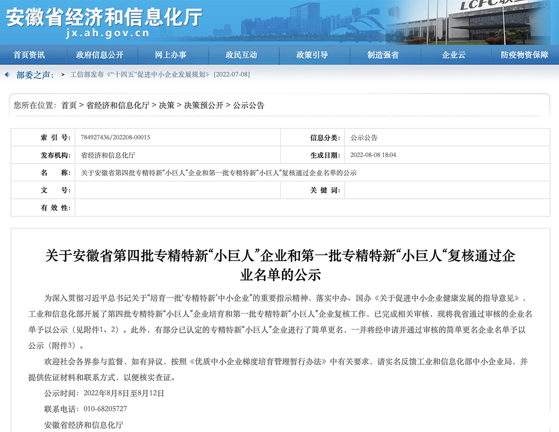 近日,经国家工业和信息化部的审核批准,安徽省经济和信息化厅发布《关于安徽省第四批专精特新“小巨人”企业名单的公示》,欧冠联赛竞猜荣膺入选,荣获国家级专精特新“小巨人”称号。