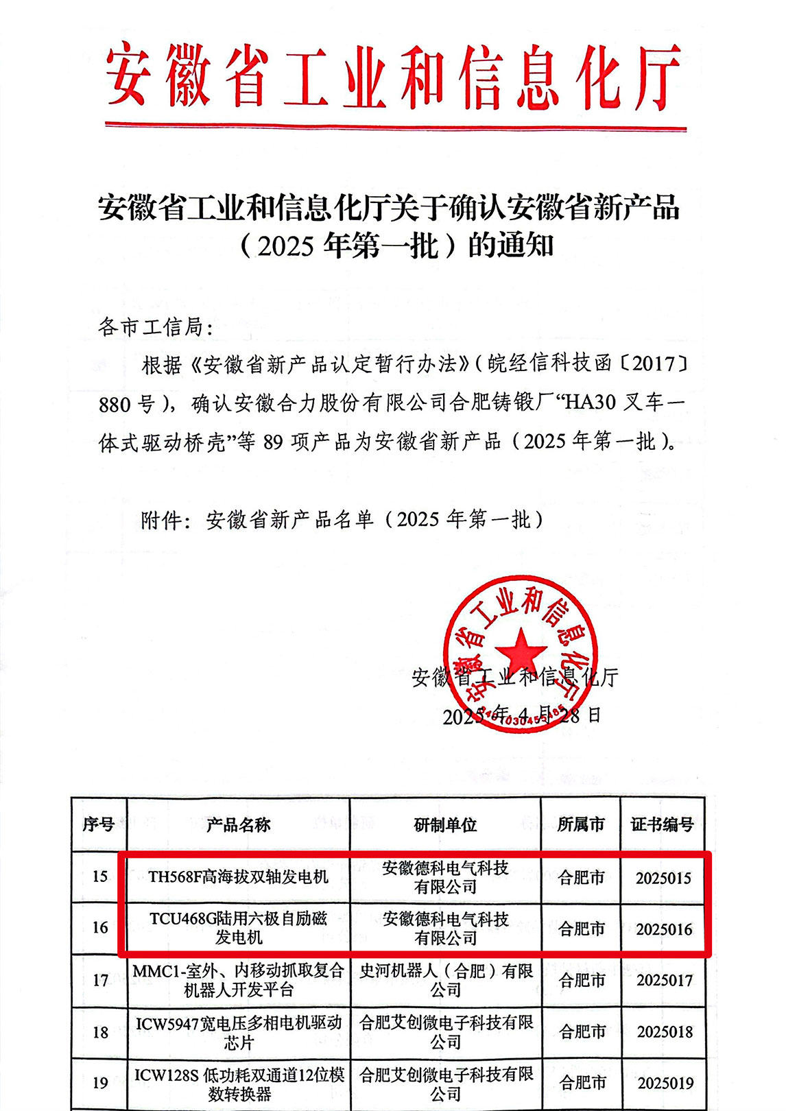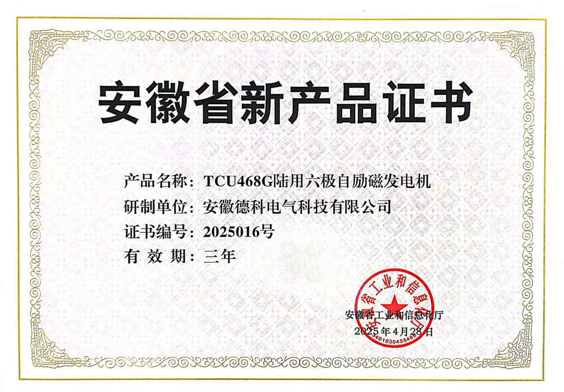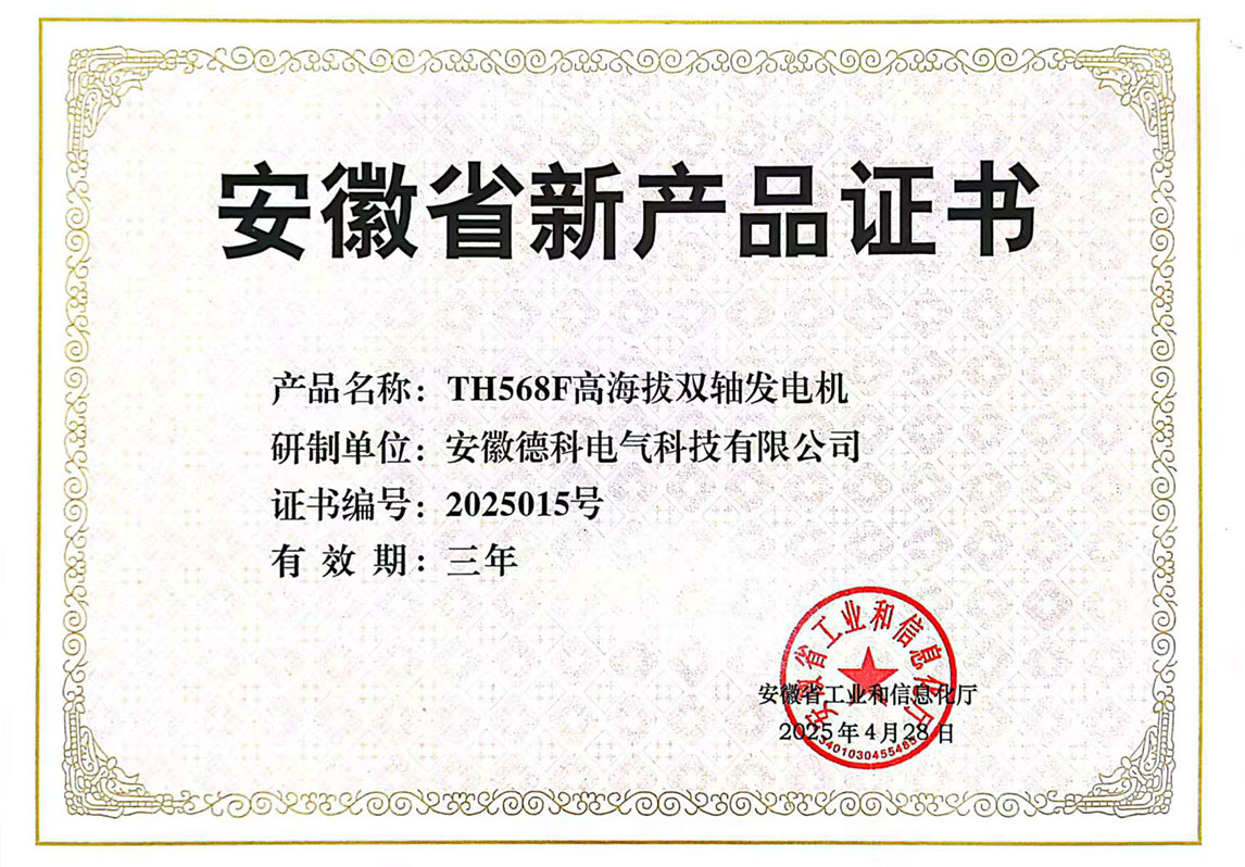 近日,安徽省工业和信息化厅正式发布《2025年第一批安徽省新产品认定名单》,欧冠联赛竞猜电气自主研发的 TCU468G陆用六极自励磁发电机 与 TH568F高海拔双轴发电机 凭借领先技术优势与卓越性能,双双通过权威评审,成功入选!